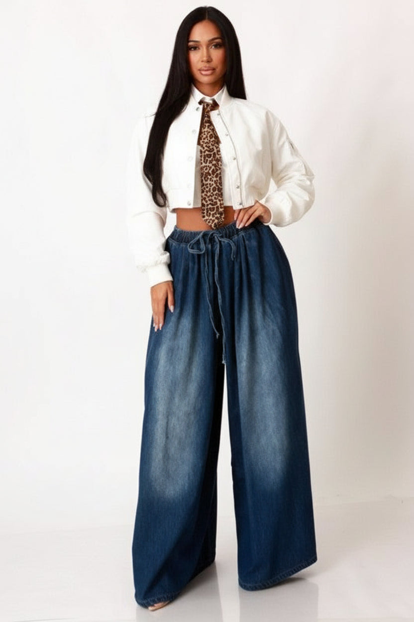 Introducing the Dina Wide Leg Denim Pants. Made from 100% cotton, these high waisted pants feature a stretchy elastic waistband that guarantees a comfortable fit. With pockets and an exaggerated wide leg design, these pants are perfect for those who love a good wide leg jean.